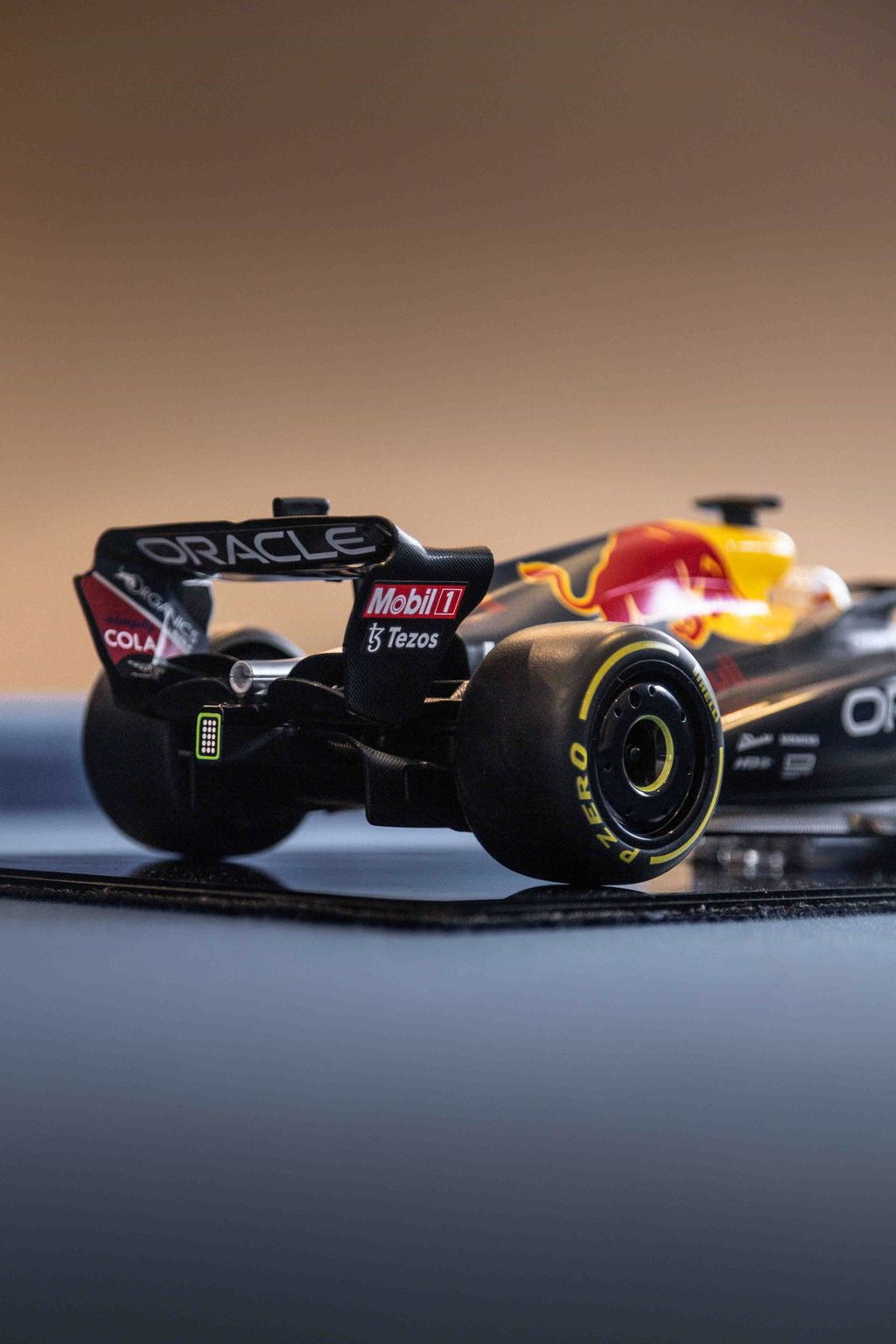 Nossa miniatura escala 1:10 é fabricada em plástico ABS, com algumas peças em carbono e os pneus são de borracha, (como rodas esterçam e giram).