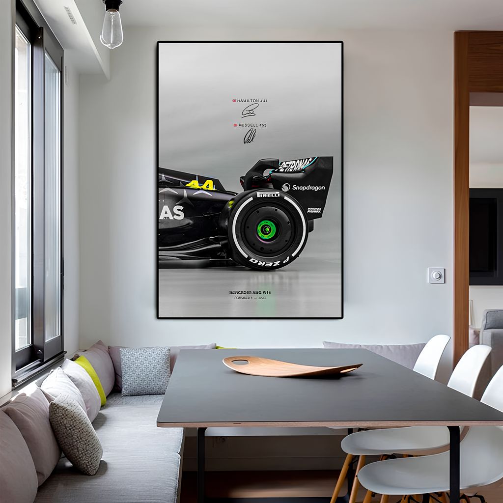 Cada detalhe da W14 é perfeitamente detalhado nesta obra, desde sua aerodinâmica sofisticada até suas linhas agressivas. A combinação de cores e toques de verde não apenas realça sua estética, mas também reflete a identidade da equipe Mercedes-AMG e sua busca incessante pela excelência nas corridas.